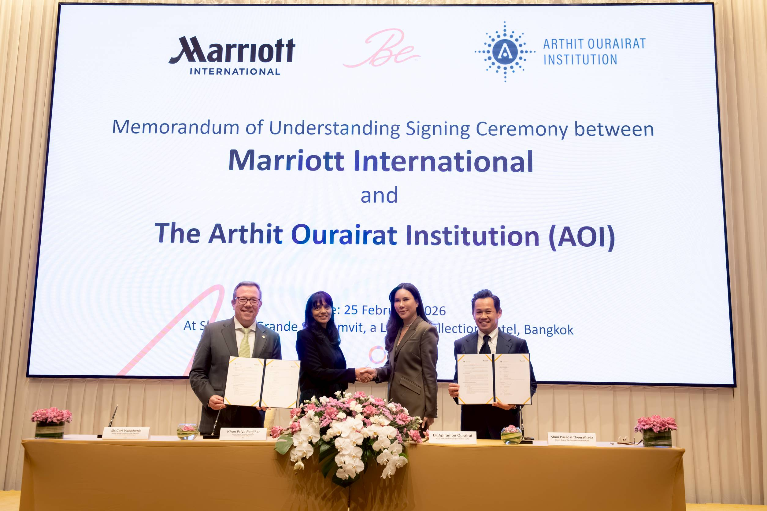 นางสาวปรียา ปัญจิการ์ (Ms. Priya Panjikar) ผู้อำนวยการอาวุโสฝ่ายทรัพยากรบุคคล – ไทย กัมพูชา และเมียนมา บริษัทแมริออท อินเตอร์เนชันแนล กล่าวถึงความร่วมมือครั้งนี้ว่า “AOI มีความโดดเด่นทั้งด้านวิชาการและการเตรียมความพร้อมสำหรับโลกการทำงานจริง จึงเป็นพันธมิตรที่เหมาะสมอย่างยิ่ง ความร่วมมือนี้ช่วยเชื่อมโยงการเรียนรู้ในห้องเรียนเข้ากับประสบการณ์จริงในธุรกิจการบริการ เปิดโอกาสให้นักเรียนได้ลงมือปฏิบัติ เรียนรู้มุมมองจากผู้เชี่ยวชาญ และสำรวจเส้นทางอาชีพในเครือข่ายระดับโลกของแมริออท”